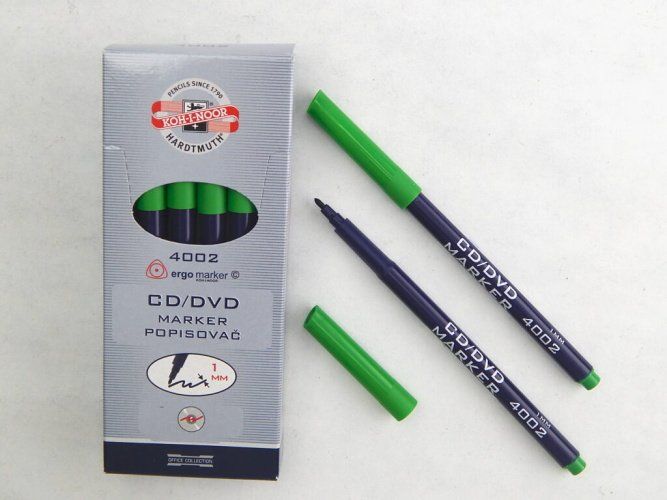Popisovač permanentní 4002 kulatý zelený CD/DVD. Popisovače plněné inkousty na alkoholové bázi, odstín červený,modrý,zelený,černý. Stopa písma je odolná otěru a působení vody.Jsou určeny k popisování CD,DVD a BD disků.V případě potřeby je možné popis odstranit lihem.Jsou osazeny kulatými hroty o průměru 2 mm a je možné psát šířkou stopy písma 1 - 2 mm, délka 600 m.Baleny jsou v papírových krabičkách po 12 ks v jednom odstínu,v soupravách po 4 ks v plastových krabičkách nebo v 1 ks PP sáčku. Vyrobeno v EU.