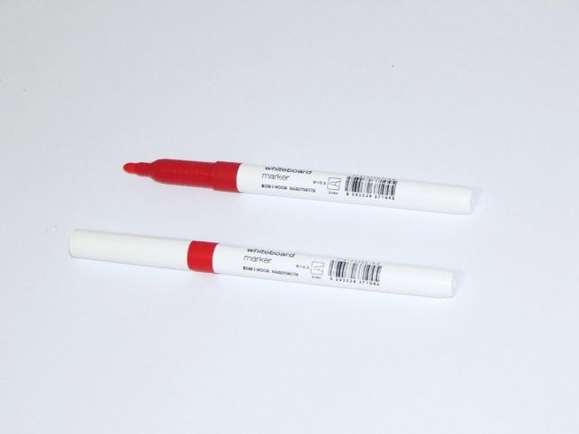 Červený whiteboard marker na alkoholové bázi - psací potřeba, určený pro psaní na bílé desky a jiné neporézní povrchy, světlostálý, za sucha stíratelný, šíře stopy 2 mm.