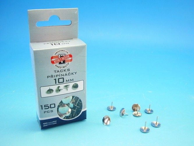 Připínáčky, průměr drátu 10 mm, průměr hlavy 10 mm, výška 10 mm, kovové. 150 ks připínáčků je uloženo v papírové krabičce. Připínáčky se používají např. na připevnění papírů na korkovou tabuli.