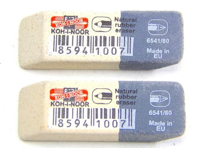 Pryž kombinovaná 6541 80. Kancelářská stěrací pryž vyrobená na přírodní bázi bez přídavků plastů a ftalátů. Měkká část (bílá) je určena pro stírání grafitových čar středních tvrdostí. Tvrdá část (šedá ) je určena pro vymazávání čar i skvrn inkoustu, tuše, písma psacích strojů a snímacích tuh.