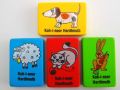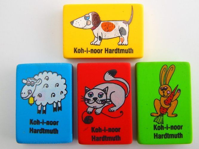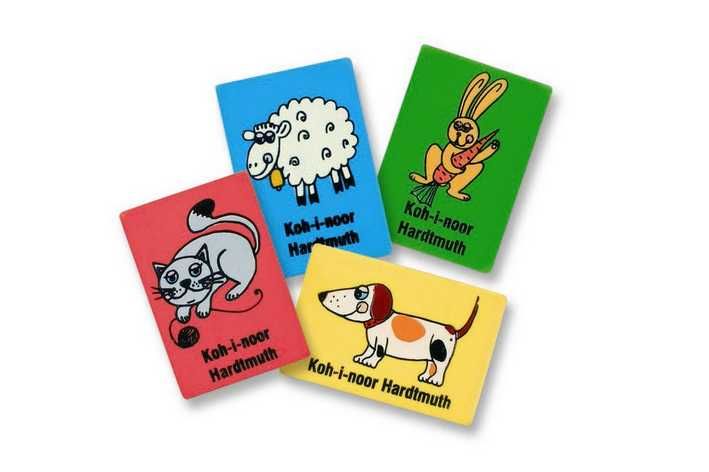 Plastická pryž netvárlivá, vhodná pro stírání grafitových čar. Hranatá, kvádrová, různé barevné modifikace. Rozměr 45 x 31 x 12 mm. Zelená pryž - barevný obrázek zajíce, červená pryž - barevný obrázek kočky, modrá pryž - barevný obrázek ovce, žlutá pryž - barevný obrázek psa.