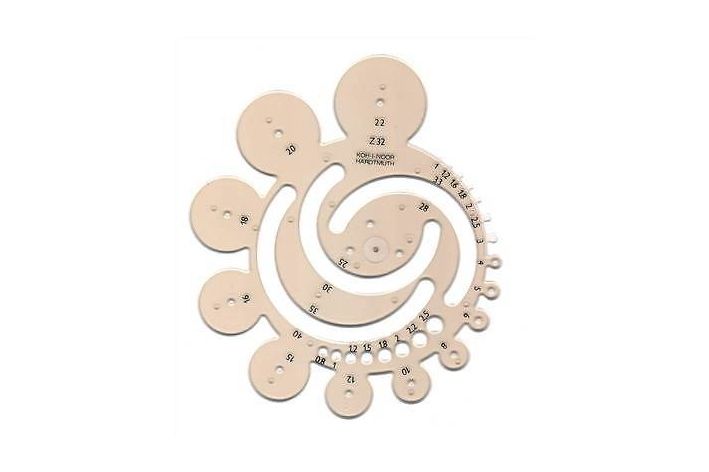 Šablona radiusová 749002 kouřová. Radiusová šablona - Z32 vyrobená z kouřového průhledného polystyrenu. Je určena pro práci s ohrocenou tužkou, mikrotužkou, versatilkou nebo technickými pery. Používá se ke kreslení a rýsování rádiusů o různých poloměrech a malých kružnic. Obsahuje kružnice o průměru 0,8 – 2,5 mm a rádiusy 1 – 40 mm. Velikost kružnic a radiusů je označena černým sítotiskem, který je při běžném používání odolný proti opotřebení. Šablona je určena k rýsování a technickému kreslení ve škole i v kanceláři. Zabalena je do pelyetylenového sáčku s eurozávěsem.