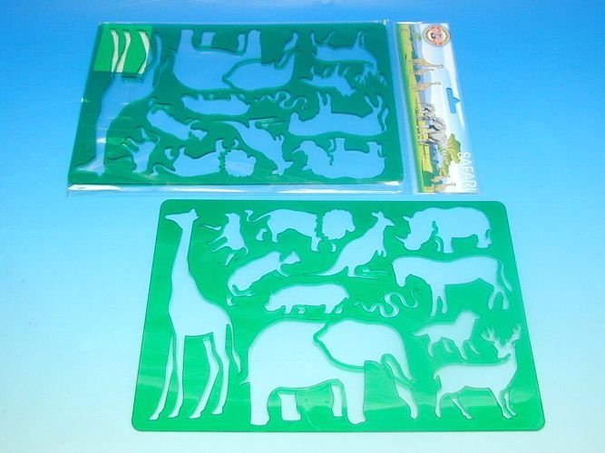 Šablona plastová na kreslení – SAFARI (motiv “divoká zvířata“), rozměry 265 x 187 mm, tl. 2 mm; uložená v PP sáčku se závěsem. Barva transparentní zelená. Šablona se používá na překreslení motivu na papír.