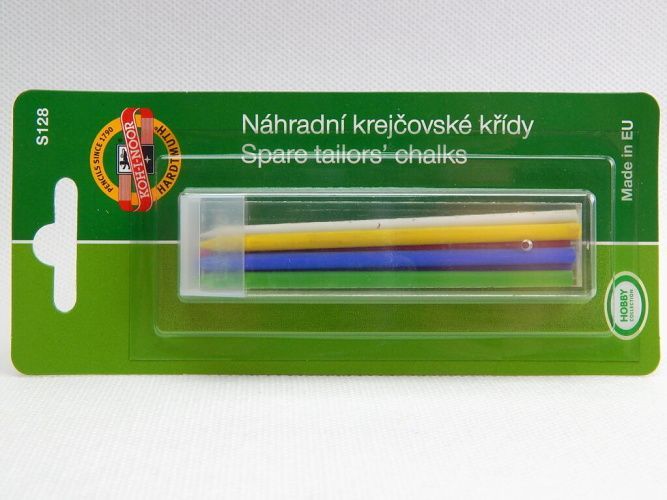 Souprava 6 ks krejčovských kříd. Souprava 6 ks krejčovských tříd v šesti barvách, pr. 3,8 mm, zabalená v plastové etui. Křídy se používají jako náhradní náplň do mechanické plastové tužky 5302, která je určena jako kreslící pomůcka pro švadlenky i pro hobby účely. Etue s křídami v barvách bílá, žlutá, zelená, modrá, růžová a fialová zabaleny v blistru s eurozávěsem.