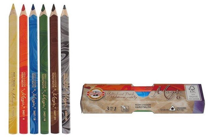 Úžasné trojhranné pastelové tužky MAGIC v dřevěném plášti z certifikovaného dřeva FSC 100% se speciálním vysoce kvalitním tříbarevným jádrem – 3 odstíny barev v jedné tuze. Ergonomický trojhranný tvar umožňuje optimální držení a vedení tužky. Tužka vytváří vícebarevnou stopu, která se mění natočením hrotu. Jedinečná pro vybarvení větších ploch, na které se má střídat více blízkých odstínů např. tráva, moře atd. Pro dosažení barevného efektu za použití různých technik kreseb /stínování, šrafování/ je výsledný efekt kresby plastičtější než u kresby klasickou pastelkou.