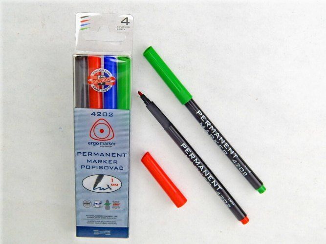Souprava permanentních popisovačů 4202 4 kulatý. Permanentní popisovače plněné inkousty na alkoholové bázi, odstín červený,modrý,zelený,černý. Stopa písma je odolná otěru a působení vody a povětrnostních vlivů.Použití je možné na většinu povrchů, zejména jsou určeny pro psaní na neporézní materiály jako kovy,sklo a porcelán,plastické hmoty,kůže,dřevo,beton a kámen,lepenka a karton.V případě potřeby je možné z neporézních materiálů smýt popis lihem.Jsou osazeny kulatými hroty o průměru 2 mm a je možné psát šířkou stopy písma 1 - 2 mm, délka 600 m.Baleny jsou v papírových krabičkách po 12 ks v jednom odstínu,v soupravách po 4 ks v plastových krabičkách nebo v 1 ks PP sáčku. Vyrobeno v EU.