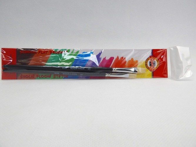 Plochý školní štětec pro školní účely. 2 ks souprava plochých štětců, velikost č. 8 a 12 v plastovém sáčku s eurozávěsem, uvnitř potištěnou papírovou vložkou. Dřík dřevěný, toulec kovový (stříbrný), vlas „prase“. Barva dříku černá. Rozměr soupravy 320 včetně eurozávěsu x 55 x 10 mm.