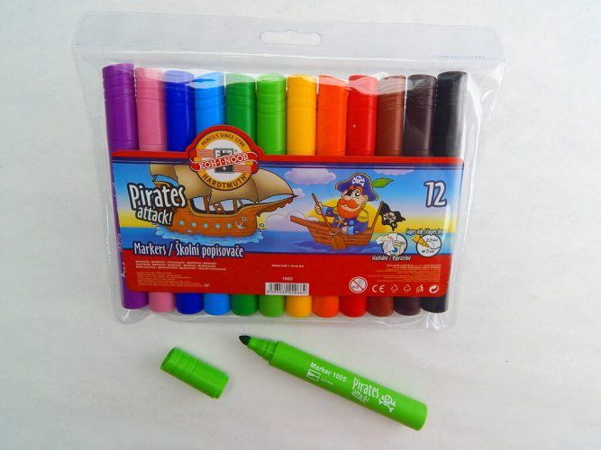 Souprava popisovačů 1005 12ks - fixy. Školní markery s bezpečnostním chránítkem,které umožňuje dýchání i v případě spolknutí. Jsou plněné pestrými vypratelnými inkousty ve 12 odstínech a vyrobeny z materiálů zajišťujících odolnost proti vyschnutí minimálně 3 roky.Hroty odolné proti zatlačení umožňují psát a malovat stopou šířky 2 – 4 mm, délka 500 m.Všechny použité materiály splňují požadavky normy EN – 71.Baleny jsou do souprav 6 a 12 ks v PP pouzdrech. nebo papírových krabičkách. Vyrobeno v EU.