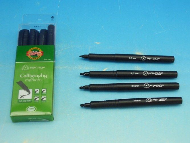 Souprava popisovačů kaligrafických 3514 4. Popisovače s propracovaným trojhranným ergonomickým úchopem, které jsou určené pro psaní a malování kaligrafickým písmem na papír. Jsou osazeny klínovými hroty ve čtyřech rozměrech, se stopou písma 1 -1.5, 1 - 2.0, 1 - 2.5 a1 - 3.0 mm, délka 500 m, 600 m, 650 m, 700 m. v závislosti na úhlu psaní.Plněny jsou sytým černým inkoustem,který má zvýšenou světlostálost. Všechny použité materiály zajišťují životnost minimálně 3 roky a splňují požadavky normy EN – 71. Baleny jsou ve 4 ks soupravách v plastových krabičkách nebo 1 – 2 ks blisterech. Vyrobeno v EU.