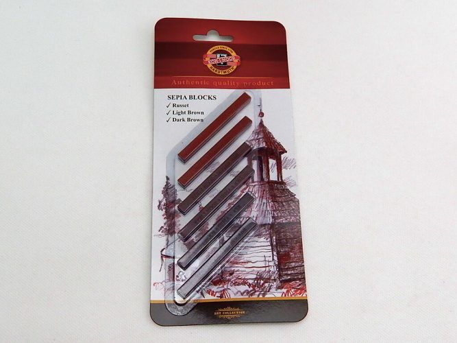 Souprava 3 druhů sépiových bloků čtyřhranného profilu v barvách: hnědočervený, hnědý světlý a hnědý tmavý. Vhodné pro umělecké kreslení i průmyslové využití. Mají velmi dobrou kryvost.