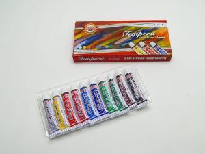 Souprava temperových barev 10 10ml. Barvy určené především pro výuku výtvarné výchovy ve školách, ale používají je i profesionální výtvarníci. Jsou vysoce kvalitní, husté, vzájemně se mísitelné, vodou ředitelné, jsou bezpečné a spolehlivě vypratelné. Barvy velmi rychle zasychají a po zaschnutí je lze znovu rozmít vodou. Základem jsou jemně utřené pigmenty rozmíchané do emulze vhodného oleje. Vyráběny v 33 odstínech a v mnoha druzích balení.