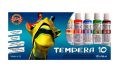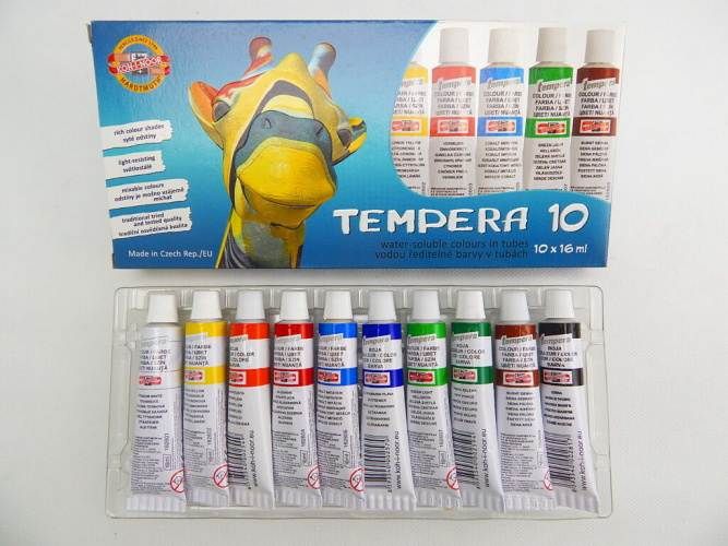 Souprava temperových barev 10. Barvy určené především pro výuku výtvarné výchovy ve školách, ale používají je i profesionální výtvarníci. Jsou vysoce kvalitní, husté, vzájemně se mísitelné, vodou ředitelné, jsou bezpečné a spolehlivě vypratelné. Barvy velmi rychle zasychají a po zaschnutí je lze znovu rozmít vodou. Základem jsou jemně utřené pigmenty rozmíchané do emulze vhodného oleje. Vyráběny v 33 odstínech a v mnoha druzích balení.