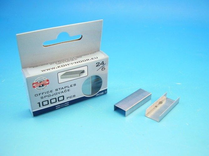 Sešívače spony 1000 ks - šířka 1 spojovače je 12 mm, výška 0,5 mm a délka 6 mm. Spony jsou kovové. Používají se jako kancelářské spojovače 24/6 do sešívaček k secvaknutí více kusů papírů. 1000 ks spojovačů je vloženo do papírové krabičky.