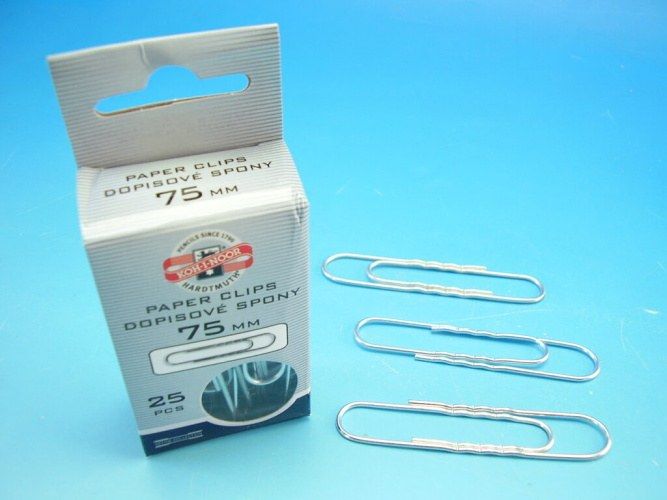 Dopisové spony 75 mm, průměr drátu 1,60 mm, délka 75 mm, šířka 6 mm. Drát je z pokoveného zinku. 150 ks spon je uloženo v papírové krabičce. Spony se používají např. na sepnutí více kusů papírů.