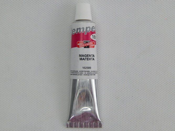 Barva temperová 16ml magenta. Barvy určené především pro výuku výtvarné výchovy ve školách, ale používají je i profesionální výtvarníci. Jsou vysoce kvalitní, husté, vzájemně se mísitelné, vodou ředitelné, jsou bezpečné a spolehlivě vypratelné. Barvy velmi rychle zasychají a po zaschnutí je lze znovu rozmít vodou. Základem jsou jemně utřené pigmenty rozmíchané do emulze vhodného oleje. Vyráběny v 33 odstínech a v mnoha druzích balení.