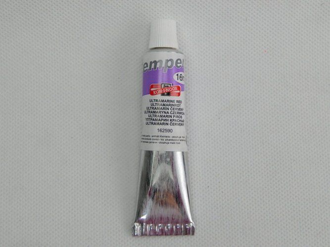 Barva temperová 16ml ultramarin červený. Barvy určené především pro výuku výtvarné výchovy ve školách, ale používají je i profesionální výtvarníci. Jsou vysoce kvalitní, husté, vzájemně se mísitelné, vodou ředitelné, jsou bezpečné a spolehlivě vypratelné. Barvy velmi rychle zasychají a po zaschnutí je lze znovu rozmít vodou. Základem jsou jemně utřené pigmenty rozmíchané do emulze vhodného oleje. Vyráběny v 33 odstínech a v mnoha druzích balení.