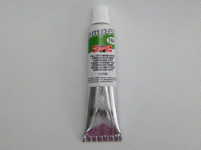 Barva temperová 16ml chromoxid tupý. Barvy určené především pro výuku výtvarné výchovy ve školách, ale používají je i profesionální výtvarníci. Jsou vysoce kvalitní, husté, vzájemně se mísitelné, vodou ředitelné, jsou bezpečné a spolehlivě vypratelné. Barvy velmi rychle zasychají a po zaschnutí je lze znovu rozmít vodou. Základem jsou jemně utřené pigmenty rozmíchané do emulze vhodného oleje. Vyráběny v 33 odstínech a v mnoha druzích balení.