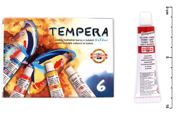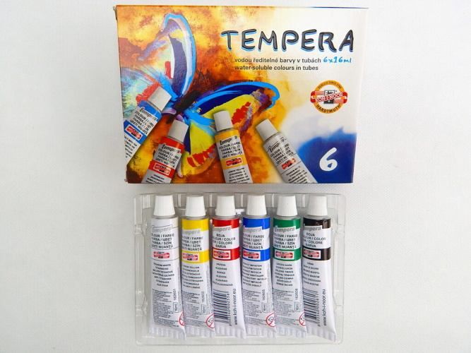 Souprava temperových barev 6. Barvy určené především pro výuku výtvarné výchovy ve školách, ale používají je i profesionální výtvarníci. Jsou vysoce kvalitní, husté, vzájemně se mísitelné, vodou ředitelné, jsou bezpečné a spolehlivě vypratelné. Barvy velmi rychle zasychají a po zaschnutí je lze znovu rozmít vodou. Základem jsou jemně utřené pigmenty rozmíchané do emulze vhodného oleje. Vyráběny v 33 odstínech a v mnoha druzích balení.