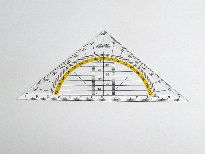 Trojúhelník 45/113 úhloměr 703031 transparentní. Trojúhelník 45/113 vyrobený z čirého průhledného polystyrenu je vhodný pro rýsování a měření přímek, kolmic, úhlů, rovnoběžek apod. Stupnice jsou tištěny technologií přesného sítotisku a při běžném používání jsou odolné proti opotřebení.. Na přeponě milimetrová stupnice od středu vždy 7 cm na obě strany s ozmačením každého celého centimetru číslicí. Úhloměrová stupnice 0-180 stupňů na odvěsnách a oblouková úhloměrná stupnice 0 - 90 stupňů uprostřed přepony na obě strany. Stupnice s dělením po jednom stupni a označením každého desátého stupně číslicí. Číslice obloukové úhloměrné stupnice jsou podbarveny žlutou barvou. Příčné milimetrové stupnice kolmé na přeponu umožňující kreslení rovnoběžek s označením každého pátého milimetru číslicí. Přesnost stupnic 0,2% délky. Trojúhelník je určený k rýsování a technickému kreslení ve škole i v kanceláři. Zabalen je do polyetylenového sáčku s eurozávěsem.