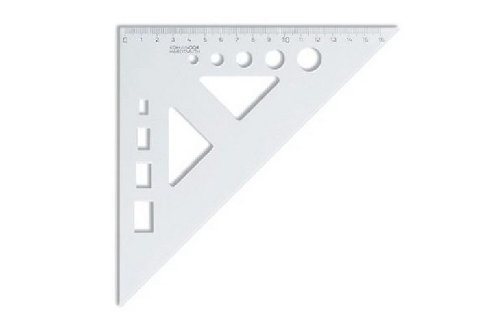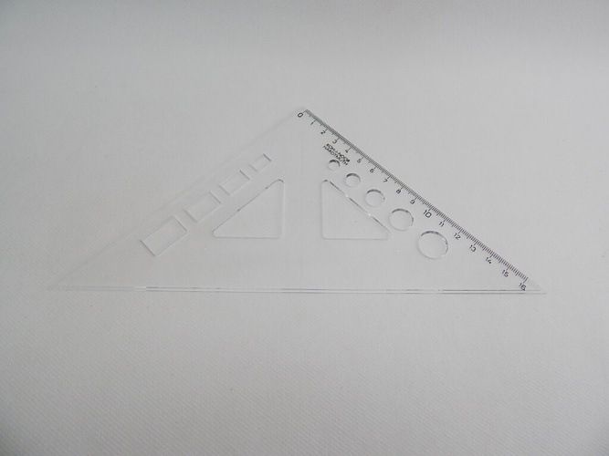 Trojúhelník 45/177 745518 transparentní. Trojúhelník 45/177 s kolmicí a výřezy vyrobený z čirého průhledného polystyrenu. Stupnice je naražena technologií horké ražby. Přesnost stupnice 0,2% délky. Mimo délkové stupnice je vybaven i ryskou pro konstruování kolmic a výřezy. Na odvěsně se stupnicí 5 výřezů pro kreslení kružnic různých velikostí. Na protilehlé odvěsně 4 výřezy pro kreslení obdélníků různých velikostí. Trojúhelník je určený k rýsování a technickému kreslení ve škole i v kanceláři. Zabalen je do polyetylenového sáčku s eurozávěsem.