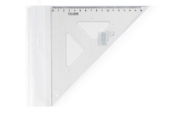 Trojúhelník 45/177 744150 transparentní. Trojúhelník 45/177 s kolmicí vyrobený z čirého průhledného polystyrenu. Stupnice je naražena technologií horké ražby. Přesnost stupnice 0,2% délky. Mimo délkové stupnice je vybaven i ryskou pro konstruování kolmic. Trojúhelník je určený k rýsování a technickému kreslení ve škole i v kanceláři. Zabalen je do polyetylenového sáčku s eurozávěsem.