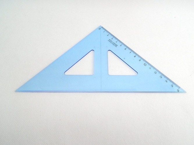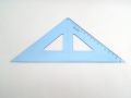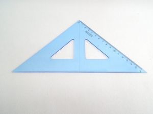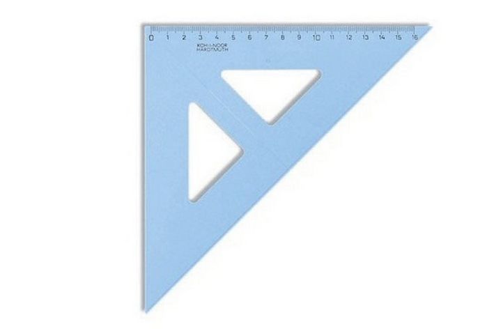 Trojúhelník 45/177 744154 modrý. Trojúhelník 45/177 s kolmicí vyrobený z modrého průhledného polystyrenu. Stupnice je naražena technologií horké ražby. Přesnost stupnice 0,2% délky. Mimo délkové stupnice je vybaven i ryskou pro konstruování kolmic. Trojúhelník je určený k rýsování a technickému kreslení ve škole i v kanceláři. Zabalen je do polyetylenového sáčku s eurozávěsem.