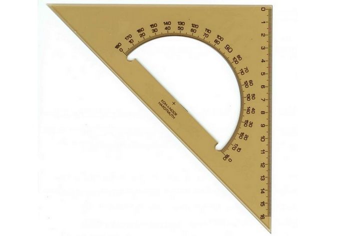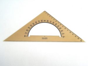 Trojúhelník 45/177 745640 kouřový. Trojúhelník 45/177 s úhloměrem vyrobený z kouřového průhledného polystyrenu. Stupnice tištěny technologií přesného sítotisku. Tisk stupnic je odolný proti opotřebení při běžném používání. Přesnost délkové stupnice 0,2% délky. Mimo délkové stupnice na odvěsně je trojúhelník vybaven obloukovým výřezem s úhloměrnou stupnicí 0 - 180° k měření a rýsování úhlů. Trojúhelník je určený k technickému kreslení a rýsování ve škole i v kanceláři. Výhodou je spojení trojúhelníku s ryskou a úhloměru 180° v jeden výrobek. Zabalen je do polyetylenového sáčku s eurozávěsem.