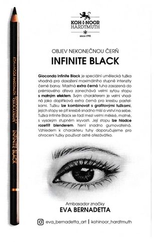 Gioconda Infinite Black je speciální umělecká tužka vhodná pro dosažení maximálního stupně intenzity černé barvy. Zanechává velmi hustou stopu s matným povrchem. Perfektní jako náhrada černé tužky s velmi vysokou intenzitou. Dobře se mísí s barevnými tužkami a funguje také s velmi měkkými tužkami. Kombinací s tužkou získá matný povrch. Je extrémně měkký a poskytuje vysoký stupeň krytí.