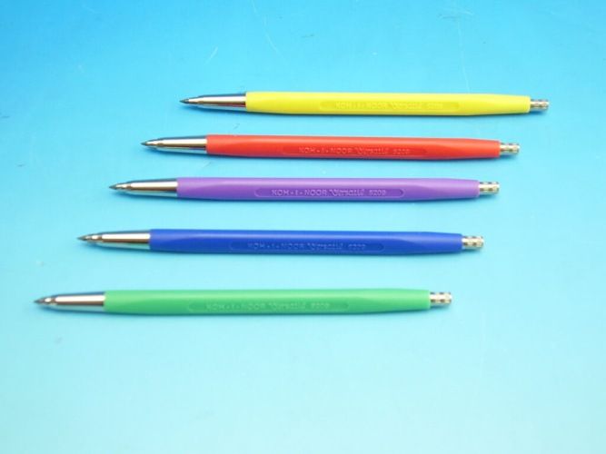 Tužka mechanická 2,0 5209. Tužka mechanická padací, kombinace kov-plast, je určena pro běžné psaní a kreslení tuhou pr. 2 mm. Tuha se posunuje stisknutím knoflíku hrotítka v nakloněné poloze tužky, tím dojde k otevření kleštiny a vysunutí tuhy dle potřeby.. Tuhu lze hrotit, hrotítko je umístěné v knoflíku, který se odšroubuje. Plášť tužky je plastový tříboký, mechanika je kovová. Tužka nemá klip. Balení je skupinové, assort 5 barev - žlutá, zelená, modrá, červená a violet, 20 ks volně vložených do kartonové krabičky.