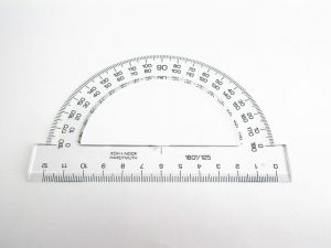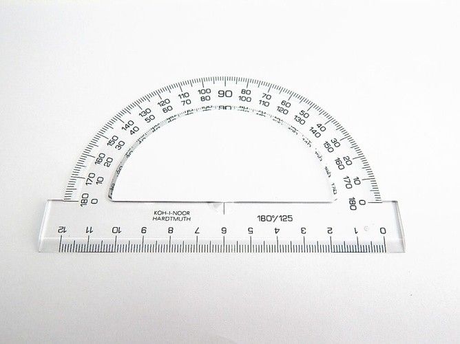 Úhloměr 180/125 746238 transparentní. Úhloměr 180/125 vyrobený z čirého průhledného polystyrenu. Stupnice tištěny technologií přesného sítotisku. Tisk stupnic je odolný proti opotřebení při běžném používání. Mimo dvou úhloměrných stupnic na oblouku je na přeponě natištěna 120 mm dlouhá délková stupnice. Úhloměr je určený k rýsování a technickému kreslení ve škole i v kanceláři. Zabalen je do polyetylenového sáčku s eurozávěsem.