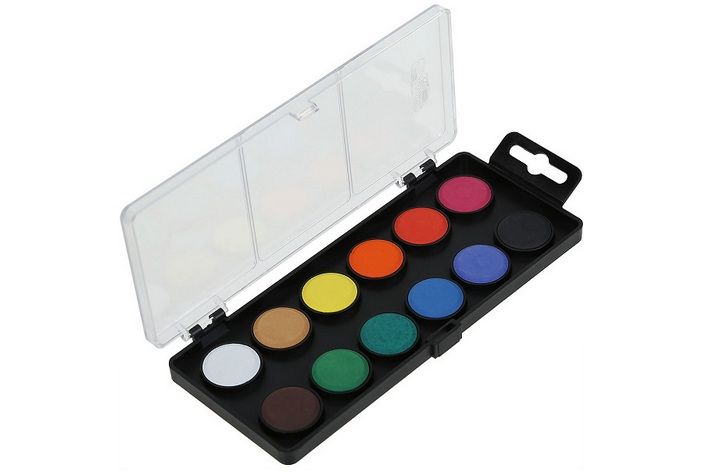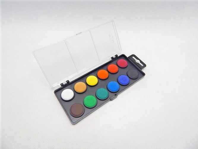 Barvy vodové 22.5 černý 12. Školní vodové barvy 12ti odstínů s tabletami o průměru 22,5 mm v obdélníkových, plastových, jednopatrových barevnících s transparentním víčkem. Barvy jsou výrazné, vyznačují se svým vysokým obsahem pigmentů. Jsou certifikované a zcela bezpečné pro děti.