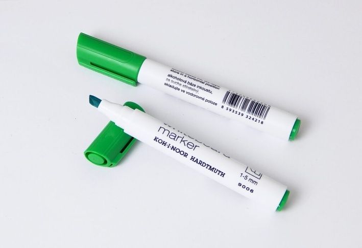 Značkovače na bílé tabule, plněné pigmentovými za sucha stíratelnými inkousty na alkoholové bázi, odstín červený, modrý, zelený, černý. Stopa písma je za sucha stíratelná. Jsou určeny pro psaní na neporézní bíle tabule ve školách a kancelářích. Při použití na papír je stopa písma světlostálá. Klínovými hroty průměru 5 mm je možné psát šířkou stopy písma 1 - 5 mm, délka 400 m. Baleny jsou v papírových krabičkách po 10 ks v jednom odstínu, v soupravách po 4 ks v plastových krabičkách nebo v 1 ks PP sáčku. Dlouhodobě je nutné skladovat ve vodorovné poloze.