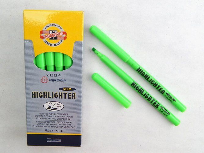 Zvýrazňovač 2004 plochý zelený. Zvýrazňovače s bezpečnostním chránítkem,které umožňuje dýchání i v případě spolknutí. Jsou plněné pestrými pigmentovými inkousty ve 4 odstínech a vyrobeny z materiálů zajišťujících odolnost proti vyschnutí minimálně 3 roky.Jsou určeny pro zvýraznění textů na všech druzích papíru.Klínové hroty jsou odolné proti zatlačení, šířka stopy 1 - 4 mm, délka 250 m. Baleny jsou v papírových krabičkách po 12 ks. v jednom odstínu,v soupravách po 4 ks v plastových krabičkách nebo v 1 ks PP sáčku. Všechny použité materiály splňují požadavky normy EN – 71. Vyrobeno v EU.
