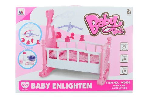 Plastová kolébka s příslušenstvím. Obsahuje kolotoč nad postýlku a set na jídlo s dudlíkem. Rozměry balení cca 53,5 x 11 x 40 cm. Věk 3+ MÍRNĚ PONIČENÝ OBAL