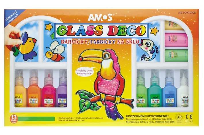 Barvy na sklo sada 13ks 22ml+fólie,šablony NAZDOBTE SI SKLO DLE VLASTNÍ FANTAZIE! Vhodné na okno, zrcadlo, dlaždice, aj. Balení obsahuje: -11ks barev na sklo 22ml -2ks kontur 22ml -13ks předloh na papíře -5ks fólií na malování -ilustrační leták NÁVOD: přiložte fólii na šablonu. Obkreslete konturou obrys šablony a nechte 1-2hodiny schnout. Poté vybarvěte obrázek a nechte 24 hodin schnout. Opatrně ho sloupněte z fólie a umístěte na zvolený povrch.