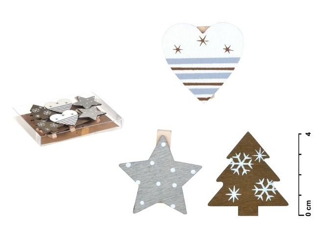 Vánoční dekorace - dřevěné kolíčky - vhodné na další kreativní tvoření, na připnutí fotky, dokumentu. Dekorace je připevněna ke kolíčku a můžete ji kdekoliv připnout. BALENÍ OBSAHUJE: - 6 ks kolíčků (srdíčka, hvězdičky, stromečky) Ozdoba je vyrobena z překližky. Uvedená cena je za 1 balení.