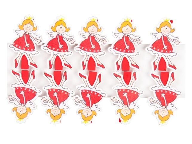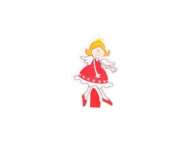 Vánoční, dřevěná dekorace andělka nalepená na červeném kolíčku, ozdobí váš vánoční dárek, přáníčka nebo je můžete kamkoliv jinam připnout a ozdobit tak váš interiér. Vyrobeno z překližky. BALENÍ OBSAHUJE: - 10 ks kolíčků (andělka) Uvedená cena je za 1 balení.