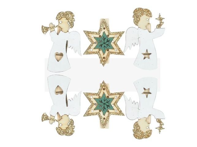 Kolíček dřevěný andělé Vánoční dřevěná dekorace - Anděl a vločka nalepená na kolíčku, ozdobí váš vánoční dárek, přáníčka nebo je můžete kamkoliv jinam připnout a ozdobit tak váš interiér. Balení obsahuje: 2 kusy anděla s trumpetou, 2 kusy vloček a 2 kusy anděla s hvězdou. Délka ozdoby: 4,8cm