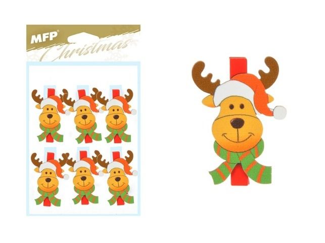 Vánoční dřevěná dekorace - sob nalepený na kolíčku, díky kterému můžete ozdobu kamkoliv připnout. Vyrobeno z překližky. Balení obsahuje: - 6 ks kolíčků Délka ozdoby: 4,8 cm Uvedená cena je za za 1 balení. Baleno vsáčku se závěsem