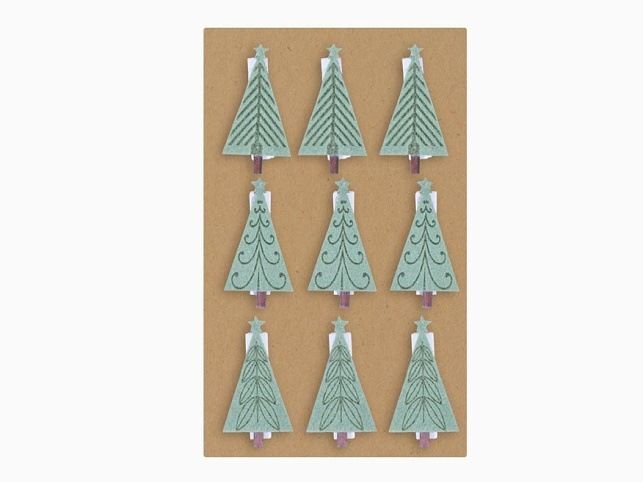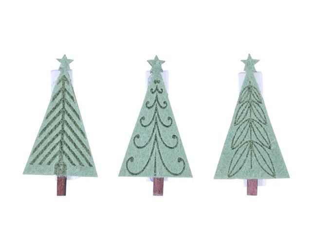 Vánoční, dřevěná dekorace kolíček se zeleným stromečkem z filcu, ozdobí váš vánoční dárek, přáníčka nebo je můžete kamkoliv jinam připnout a ozdobit tak váš interiér. BALENÍ OBSAHUJE: - 9 ks kolíčků (stromek) Uvedená cena je za 1 balení.