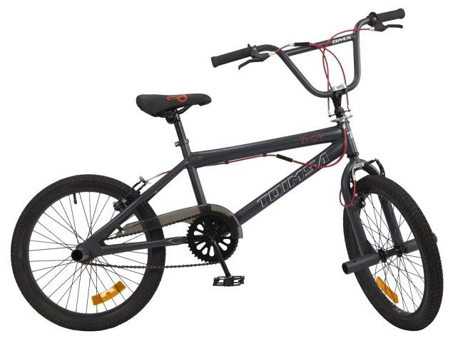 Dětské šlapací kolo Toimsa BMX černo/červené 20". Vybavení kola – lakovaný rám, přední a zadní brzda, odrazka, nastavitelná řídítka a sedlo, nafukovací kola a kryt řetězu. Vhodné pro děti od sedmi let – pro výšku 120–135 cm.