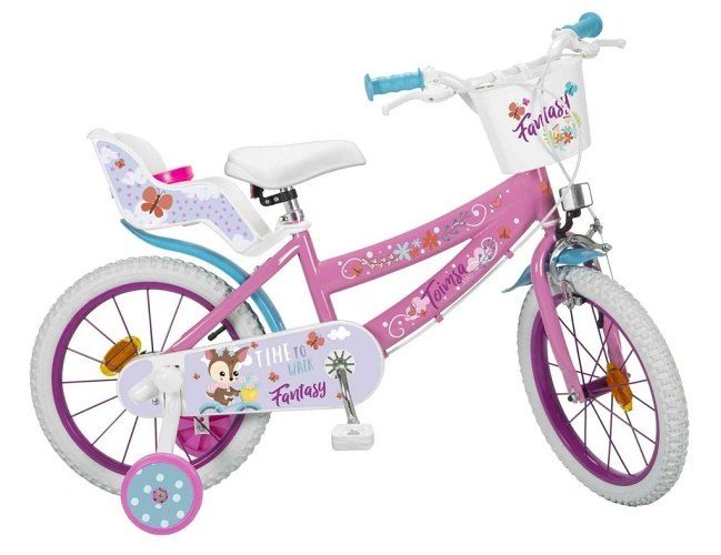 Dětské šlapací kolo Toimsa Fantasy Walk růžovo/modré 16". Vybavení kola – lakovaný rám, přední a zadní brzda, odrazka, nastavitelná řídítka a sedlo, přední a zadní blatník, odrazky, přední košíček a zadní sedačka pro panenky, odnímatelná stabilizační kolečka, nafukovací kola a kryt řetězu. Vhodné pro děti od pěti do sedmi let. .