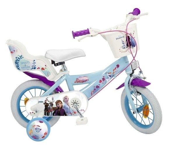 Dětské šlapací kolo Toimsa Ledové království modro/bílé 12". Vybavení kola – lakovaný rám, přední a zadní brzda, odrazka, nastavitelná řídítka a sedlo, přední a zadní blatník, odrazky, přední košíček a zadní sedačka pro panenky, odnímatelná stabilizační kolečka, nafukovací kola a kryt řetězu. Vhodné pro děti od od tří do pěti let.