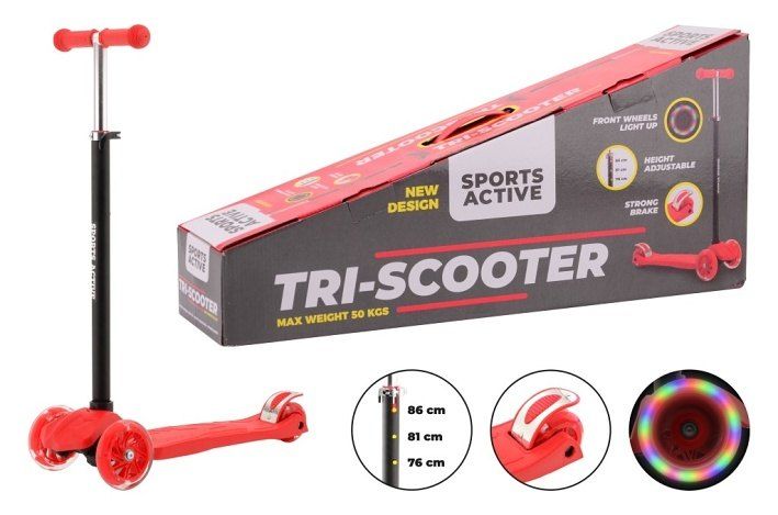 Tříkolová koloběžka s posuvnými řídítky v červeno-černém provedení. Výška řídítek lze nastavit na výšku 76, 81 a 86 cm. Maximální nosnost 50 kg.