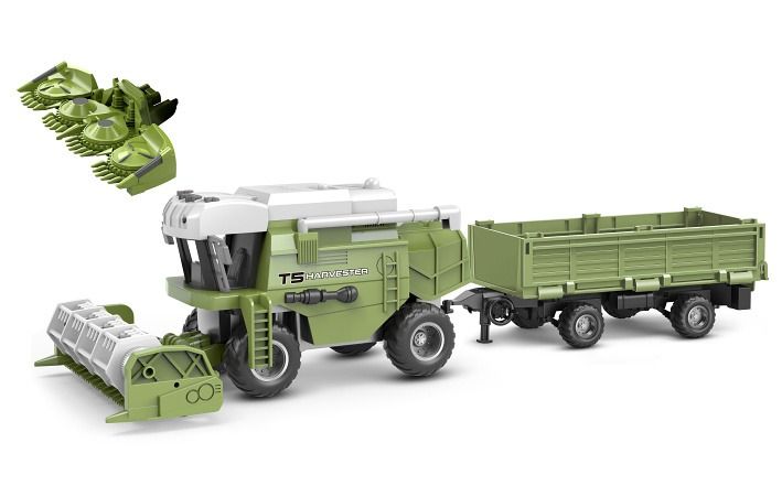 Kombajn s vlečkou. Velikost 48cm. S vyměnitelnými nástavci. Na setrvačník. Světelné a zvukové efekty. Baterie 3xAG13 součástí.
