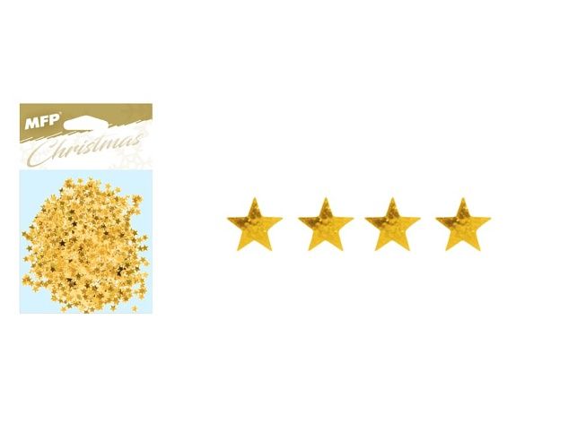 Konfety hvězdičky - vhodné pro výzdobu místnosti, stolů, pro výrobu vánočních dekorací aj. BALENÍ OBSAHUJE: - zlaté lesklé hvězdičky Hmotnost: 20 g Uvedená cena je za 1 balení. Konfety jsou baleny v sáčku se závěsem.