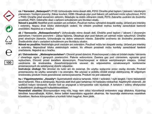 Nestřílet proti osobám ani zvířatům. Používat mohou výhradně dospělé osoby. Určené pro interiéry i exteriéry. Nepoužívat blízko elektrických vedení. Ve vlhkém prostředí mohou konfety zanechávat barevné znečištění. Nejedná se o hračku!