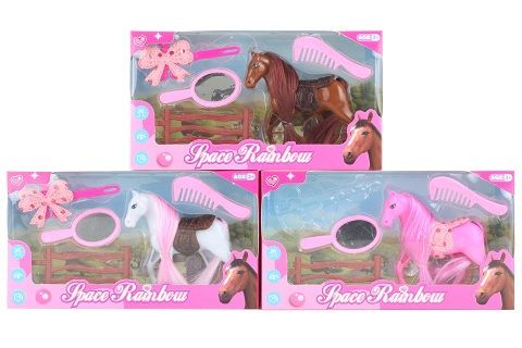 Plastový česací kůň s doplňky. Balení obsahuje koně o velikosti cca 10 x 8,5 cm, hřebínek, zrcátko, sponku a další doplňky. Rozměry balení cca 20 x 11 x 3,5 cm. Věk 3+
