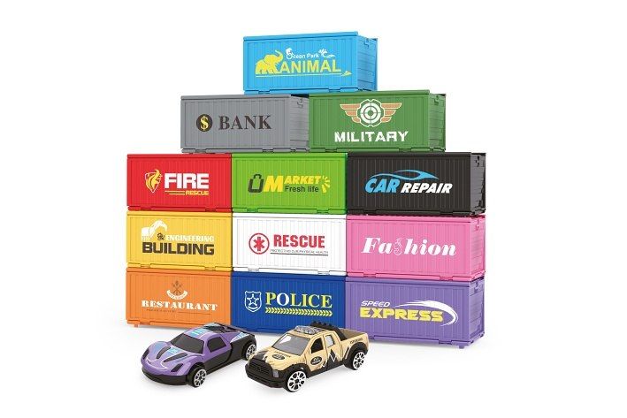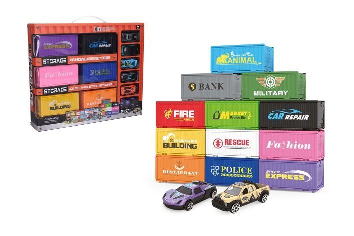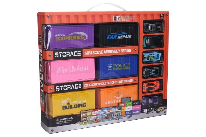 Kontejnerové město - 6 kontejnerů. Velikost kontejneru 12,5 cm, auta 7 cm. Obsahuje 6 kontejnerů, 6 kovových aut s volnými koly. Každý kontejner obsahuje 1 kovové auto, 2 budovy, 2 pouliční lampy, semafor, ulici, 2 figurky, polepy, obrázkový návod na sestavení.