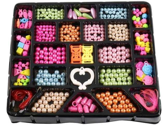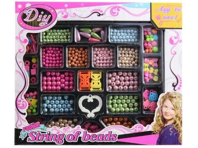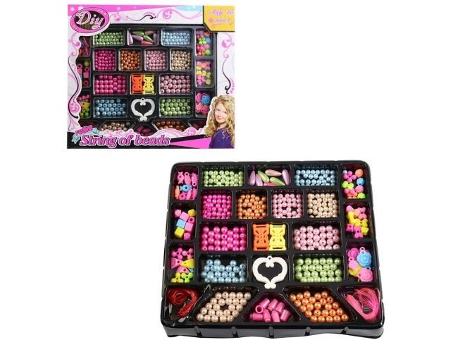 Kreativní sada pro výrobu náramků a ozdob do vlasů potěší jistě každou malou slečnu. Zvláště, když si může ozdoby sama vytvořit podle svého vlastního vkusu. Sada obsahuje menší (5 mm) i větší (8 mm) kulaté korálky, i korálky různě tvarované. Dále dvě přezky, několik přívěsků, dva plastové provázky. Tedy vše potřebné pro dokonalý výrobek. Rozměr boxu 27 x 23 x 4 cm. Vhodné pro děti od 3 let.